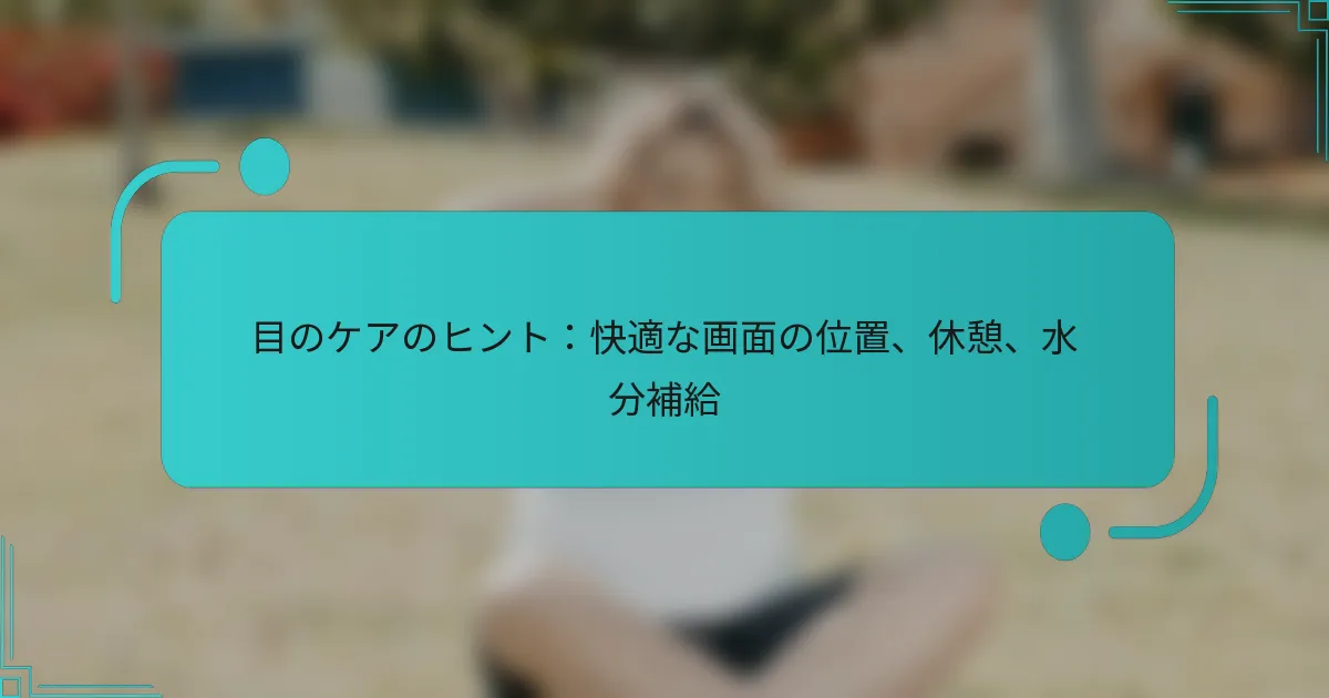 スクリーンを使用する際に目を大切にすることは、快適さと健康のために重要です。適切なスクリーンの位置、定期的な休憩、水分補給は、目の疲れを大幅に軽減し、全体的な視覚体験を向上させることができます。これらの簡単なヒントに従うことで、目を保護し、長時間のスクリーン使用中にその健康を維持することができます。 快適さのための最適なスクリーンの位置付けとは? スクリーンを使用する際に快適さを確保するためには、正しく位置付けることが不可欠です。これには、最適な距離を保ち、高さと角度を調整し、明るさとコントラストを管理して目の疲れを軽減することが含まれます。 目の疲れを減らすための最適なスクリーン距離 目とスクリーンの理想的な距離は通常20インチから30インチ(50センチメートルから75センチメートル)です。この距離は、目が過度の努力をせずに快適に焦点を合わせることを可能にし、目の疲れを最小限に抑えます。 作業スペースを設定する際は、スクリーンのサイズを考慮してください。大きなスクリーンは不快感を避けるためにより大きな距離が必要な場合があります。例えば、27インチのモニターはこの範囲の遠い端に位置付けるのが最適かもしれません。 特に近づいていると感じる場合は、定期的にスクリーン距離を確認してください。椅子や机の高さを調整することで、この最適な距離を維持するのに役立ちます。 人間工学的なセットアップのための理想的なスクリーンの高さと角度 スクリーンは、ディスプレイの上部が目の高さと同じかやや下になるように位置付けるべきです。これにより、スクリーンを見るときに目がわずかに下向きになるため、より自然な姿勢になります。 スクリーンの角度は、約10度から20度後ろに傾けるべきです。このセットアップは、まぶしさを軽減し、より快適な視聴体験を提供し、首の疲れを最小限に抑えます。 これを実現するために、椅子の高さを調整するか、モニタースタンドを使用してください。タイピング時には、足が地面に平らに置かれ、肘が90度の角度になるようにしてください。 快適さのためのスクリーンの明るさとコントラストの調整 スクリーンの明るさは、周囲の光に合わせるべきです。スクリーンが周囲の光よりもかなり明るい場合、目の疲れを引き起こす可能性があります。快適に感じ、まぶしさを軽減する明るさのレベルを目指してください。 コントラスト設定も同様に重要です。高いコントラスト比はテキストを読みやすくしますが、過度のコントラストは不快感を引き起こす可能性があります。目を疲れさせずにテキストが明確に見えるまでコントラストを調整してください。 日中の時間や周囲の光の条件に基づいて明るさを自動的に調整するソフトウェアを使用することを検討し、1日を通して快適さを維持してください。 反射を最小限に抑えるためのアンチグレアスクリーンの使用 アンチグレアスクリーンは、上部の照明や窓からの反射を大幅に減少させることができ、これが気を散らす原因となり、目の疲れを引き起こすことがあります。これらのスクリーンは光を拡散させ、目を細めずにディスプレイを見ることを容易にします。 アンチグレアスクリーンを選択する際は、モニターのサイズに適合するオプションを探してください。一部のスクリーンには内蔵のアンチグレア技術があり、他のものは追加のフィルターが必要な場合があります。 明瞭さを維持するために、定期的にスクリーンを清掃してください。ほこりや汚れはまぶしさを悪化させる可能性があるため、マイクロファイバークロスを使用してディスプレイを清潔に保ってください。 複数のスクリーンを効果的に配置する方法 複数のスクリーンを使用する際は、首の動きを最小限に抑えるように配置してください。理想的には、主要なスクリーンはあなたの正面にあり、副次的なスクリーンはわずかにあなたの方に向けて角度を付けるべきです。 スクリーン間の距離を一定に保ち、目の疲れを避けてください。一方のスクリーンが他方よりもかなり近い場合、焦点を切り替える際に不快感を引き起こす可能性があります。 必要に応じてスクリーンを簡単に再配置できるモニターアームや調整可能なスタンドの使用を検討してください。この柔軟性は、人間工学的なセットアップを維持し、生産性を向上させるのに役立ちます。 スクリーン使用からどのくらいの頻度で休憩を取るべきですか? スクリーン使用からの定期的な休憩は、目の健康と快適さを維持するために不可欠です。専門家は、目の疲れと疲労を軽減するために、20分から30分ごとに休憩を取ることを推奨しています。 目の健康のための休憩の推奨頻度 長時間のスクリーン使用中に目を保護するために、20分から30分ごとに休憩を取ることを目指してください。この頻度は不快感を軽減し、デジタル目の疲れのリスクを減少させます。長時間作業する場合は、これらの休憩