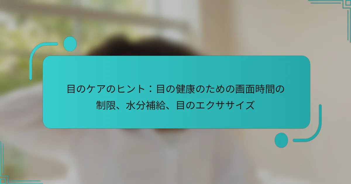 最適な目の健康を維持するには、画面時間の管理、水分補給、目のエクササイズを日常に取り入れるなど、多面的なアプローチが必要です。年齢に応じて画面時間を制限することで、不快感や疲労を防ぐことができ、適切な水分補給は目を潤い、快適に保ちます。さらに、定期的な目のエクササイズは緊張を和らげ、集中力を向上させ、全体的な目の健康を促進します。 目の健康のために推奨される画面時間の制限は? 最適な目の健康を維持するためには、年齢に応じて画面時間を制限することが重要です。専門家は、デジタルデバイスの長時間使用に伴う目の疲れや不快感を防ぐための具体的な時間制限を提案しています。 20-20-20ルールの理解 20-20-20ルールは、画面使用中の目の疲れを軽減するためのシンプルなガイドラインです。画面を見ている20分ごとに、20フィート離れたものを20秒間見ることを推奨します。この習慣は目の筋肉をリラックスさせ、疲労を大幅に軽減することができます。 20-20-20ルールを日常生活に取り入れるのは簡単です。タイマーを設定するか、休憩を促すアプリを使用しましょう。この小さな調整が、全体的な目の快適さに大きな違いをもたらします。 年齢に基づく画面時間の推奨 2歳未満の子供:ビデオチャットを除いて、画面時間はなし。 2歳から5歳の子供:高品質のプログラムを1日1時間に制限。 6歳以上の子供:レクリエーションの画面時間は一貫して制限し、理想的には1日1〜2時間以内。 大人:1時間ごとに休憩を取り、目の健康を維持するために全体の画面使用を制限。 これらの推奨は、画面時間が睡眠、身体活動、その他の健康や発達の重要な側面に干渉しないようにするためのものです。 過剰な画面時間の兆候 過剰な画面時間は、目が疲れていることを示すさまざまな症状を引き起こす可能性があります。一般的な兆候には、乾燥、刺激、視力のぼやけ、頭痛が含まれます。これらの症状に気付いた場合は、画面習慣を再評価する時期かもしれません。 さらに、遠くの物に焦点を合わせるのが難しい、または長時間使用後に不快感を感じることも警告サインです。これらの兆候に気付くことで、画面時間を適時調整することができます。 画面時間を管理するための戦略 効果的に画面時間を管理するには、明確な境界を設定し、定期的な休憩を取り入れることが重要です。画面時間追跡アプリなどのツールを使用して使用状況を監視し、家族に合った制限を設けましょう。 屋外での遊びや読書などの代替活動を奨励し、画面時間のバランスを取ります。特に食事中や就寝前に、テクノロジーのないゾーンを作ることも、より健康的な習慣を促進します。 青色光が目の健康に与える影響 画面から発せられる青色光は、デジタル目の疲れを引き起こし、睡眠パターンを乱す可能性があります。青色光の長期的な影響はまだ研究中ですが、多くの人々が長時間の画面使用後に不快感が増すと報告しています。 青色光の影響を軽減するために、デバイスに青色光フィルターを使用したり、青色光をブロックするために設計された眼鏡をかけたりすることを検討してください。さらに、画面の明るさを下げたり、夜間モードの設定を使用したりすることで、特に夕方に目の疲れを軽減できます。 水分補給は目の健康にどのように影響しますか? 水分補給は、目の健康を維持するために重要な役割を果たし、目の潤いを確保します。適切な水分補給は、乾燥や刺激を防ぎ、視力や全体的な快適さに悪影響を及ぼすことを防ぎます。 目の潤いを維持するための水分補給の役割 水分補給は、目を潤滑に保つ涙の生成に不可欠です。体が十分に水分を補給されていると、涙の膜が安定し、ドライアイ症候群のリスクが減少します。逆に、水分不足は涙の生成を減少させ、不快感や視力の問題を引き起こす可能性があります。 さらに、適切な水分補給は目の組織全体の健康をサポートし、その構造と機能を維持します。これは、潤いを保つことで透明で健康な状態を保つ角膜にとって特に重要です。 目の健康のための推奨される1日の水分摂取量 1日の水分摂取量の一般的な推奨は、女性で約2.7リットル(91オンス)、男性で約3.7リットル(125オンス)であり、すべての飲料や食べ物を含みます。ただし、個々の必要量は、活動レベル、気候、全体的な健康状態などの要因によって異なる場合があります。 最適な目の健康を確保するために、一度に大量の水を飲むのではなく、1日を通して定期的に水を飲むことを目指しましょう。良い目安は、食事のたびにグラス1杯の水を飲み、定期的な摂取を促すために水筒を手元に置いておくことです。 目の機能に役立つ水分補給食品 水分補給食品を食事に取り入れることで、全体的な水分摂取量と目の健康に大きく貢献できます。水分含有量の高い食品は、潤いを提供するだけでなく、目の機能に必要な栄養素も供給します。以下は、役立つ選択肢です: スイカ キュウリ オレンジ イ