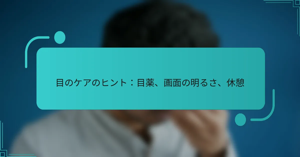 今日のデジタル時代において、目のケアはこれまで以上に重要です。特に長時間画面の前にいる人にとってはなおさらです。効果的な目薬を使用することで、乾燥や刺激を和らげることができ、画面の明るさを管理することは目の疲れを防ぐために重要です。さらに、定期的に休憩を取り入れることで、目の快適さと全体的な健康を大幅に向上させることができます。 画面使用者に効果的な目薬とは? 画面使用者に効果的な目薬は、長時間の画面使用によって引き起こされる不快感を和らげるのに役立ちます。これらの目薬は、乾燥、刺激、アレルギー症状を緩和し、デジタル時代における目の健康を維持するために不可欠です。 乾燥緩和のための目薬の種類 乾燥緩和のために特別に設計された目薬にはいくつかの種類があります。最も一般的なのは人工涙液で、自然な涙を模倣し、目に潤いを与えます。これらの目薬は、防腐剤不使用のものと防腐剤を含むものがあり、防腐剤不使用のオプションは頻繁に使用する際に優しいです。 もう一つのカテゴリーには、ゲルタイプの目薬があります。これらは粘度が高いため、より長時間の緩和を提供します。特に重度の乾燥を経験する人や、長時間画面の前にいる人にとって便利です。 人工涙液:自然な涙を模倣し、防腐剤ありまたはなしで利用可能。 ゲルタイプの目薬:長時間の緩和のための粘度が高い。 潤滑目薬を使用するタイミング 潤滑目薬は、特に長時間の画面使用後に乾燥の症状を感じたときに使用するべきです。快適さを防ぐために、長時間のコンピュータ作業を始める前に適用することをお勧めします。 さらに、休憩中にこれらの目薬を使用することで、潤いのレベルを維持するのに役立ちます。エアコンの効いたオフィスなど、乾燥した環境にいる場合は、潤滑目薬が特に有益です。 アレルギー緩和のための抗ヒスタミン目薬 抗ヒスタミン目薬は、かゆみや赤みなどのアレルギー関連の目の症状に悩む人に効果的です。これらの目薬はヒスタミン受容体をブロックすることで、アレルギー反応からの迅速な緩和を提供します。 アレルギーの季節や花粉の多い環境では特に役立ちます。自分の特定のニーズに合った抗ヒスタミン目薬を選ぶために、必ず医療提供者に相談してください。 重度の症例に対する処方オプション 重度の目の状態には、処方の目薬が必要な場合があります。これには、より強力な抗炎症目薬や、ドライアイ症候群や重度のアレルギーのような状態に特化した薬が含まれることがあります。 自分の症状や病歴に基づいて適切な処方を決定するために、眼科専門家に相談することが重要です。治療の効果を監視するために、定期的なフォローアップが必要な場合があります。 適切な目薬の選び方 適切な目薬を選ぶには、自分の特定の症状やライフスタイルを考慮する必要があります。一般的な乾燥には、人工涙液や潤滑目薬がしばしば十分です。アレルギーが懸念される場合は、抗ヒスタミン目薬がより適切かもしれません。 常に成分を確認し、基礎疾患がある場合や他の薬を服用している場合は、医療専門家に相談してください。頻繁に使用する予定がある場合は、防腐剤を含む目薬の使用を避けるべきです。時間が経つにつれて刺激を引き起こす可能性があります。 画面の明るさは目の健康にどのように影響しますか? 画面の明るさは、目の疲れや不快感を引き起こす要因として、目の健康に大きな影響を与えます。高い明るさの設定は、特に長時間の画面使用中に、乾燥、疲労、ぼやけた視界などの症状を引き起こす可能性があります。 高い明るさが目の疲れに与える影響 高い明るさの設定は、特に暗い環境では目の疲れを悪化させる可能性があります。画面が明るすぎると、画面と周囲の光とのコントラストが強くなり、目がより多くの労力を必要とし、不快感を引き起こします。 目の疲れの一般的な症状には、頭痛、ドライアイ、焦点を合わせるのが難しいことが含まれます。これらの症状は、長時間の画面使用によって悪化する可能性があるため、明るさのレベルを監視し、調整することが重要です。 目の疲れを軽減するために、画面の明るさを周囲の光に合わせて減少させることを検討してください。この調整は、目への負担を軽減し、使用中の全体的な快適さを向上させるのに役立ちます。 異なる環境における最適な画面の明るさ設定 最適な画面の明るさは、環境によって異なります。明るい部屋では、視認性を確保するために高い明るさの設定が必要な場合がありますが、暗い場所ではより低い設定が望ましいです。 明るい環境:明るさを70-100%に設定。 中程度の明るさ:明るさを40-70%に設定。 低照度条件:明るさを40%未満に保つ。 周囲に応じて明るさを定期的に調整することで、視覚的な快適さを維持し、目の疲れのリスクを減少させることができます。デバイスに自動明るさ調整機能がある場合は、それを利用することを検討し